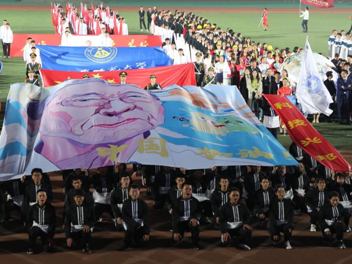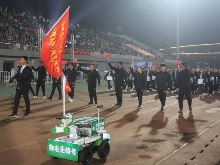 国士无双,科技兴邦。10月27日晚,校运会开幕式上学院方阵队迈着整齐坚定的步伐,喊着铿锵有力的口号,在学院特色科技创新作品“物电先锋号”机器小车的引领走过主席台,向全校师生展示了物电人的风采。学院方阵元素:国士无双,科技兴邦!在特殊年份用这种特别的方式向抗疫英雄致敬。排舞队整齐划一的舞步跳出了物电学子的青春活力,一曲《我们都是追梦人》点燃了全场的热情,将开幕式气氛推向高潮。