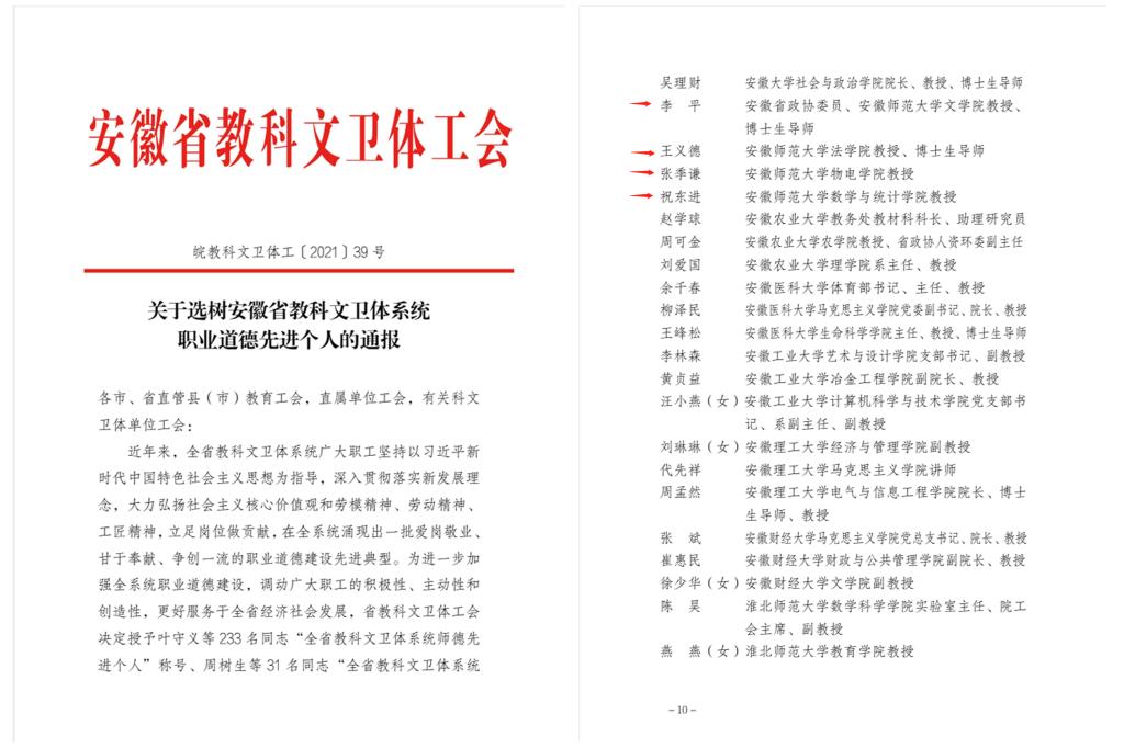 为进一步加强全省教科文卫体系统职业道德建设,充分调动广大职工的积极性、主动性和创造性,更好服务于全省经济社会发展,省教科文卫体工会授予233名同志“全省教科文卫体系统师德先进个人”称号,无翼鸟 张季谦教授与我校文学院李平、法学院王义德、数统学院祝东进三位教师获此殊荣。