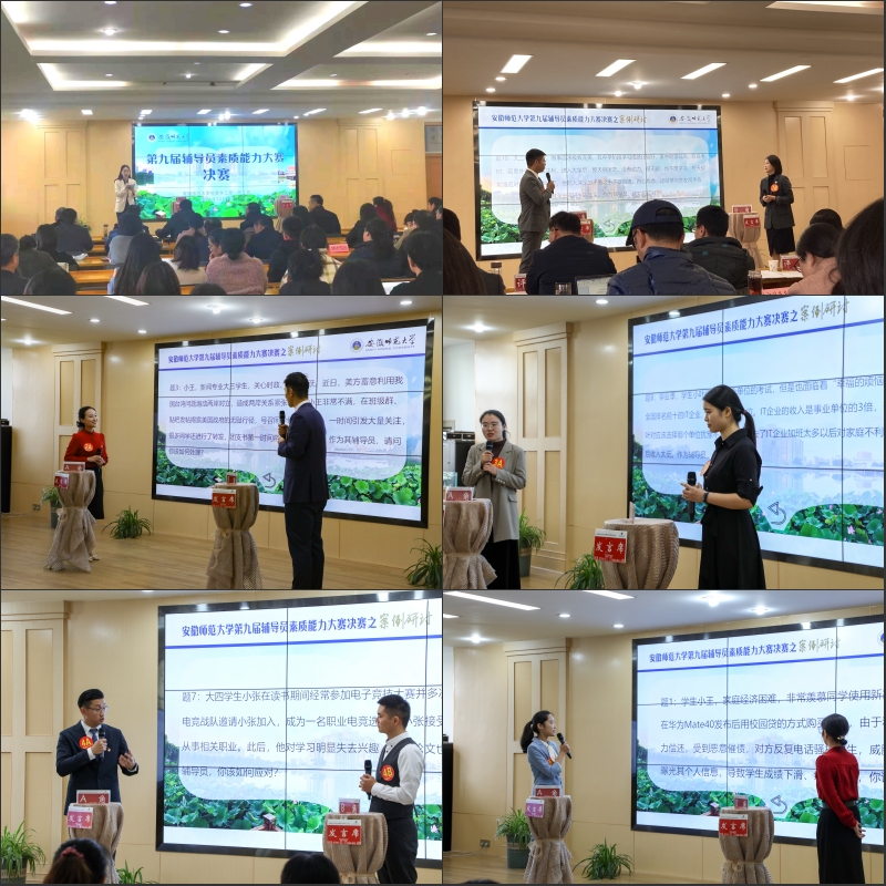 本网讯(学工部)12月1日,校第九届辅导员素质能力大赛决赛在大学生活动中心三楼报告厅举行。校党委常委、副校长陆林,安徽建筑大学、安徽工程大学、皖南医学院等学工部以及学校相关职能部门负责人担任评委。各学院党委副书记,全体专、兼职辅导员现场观摩。