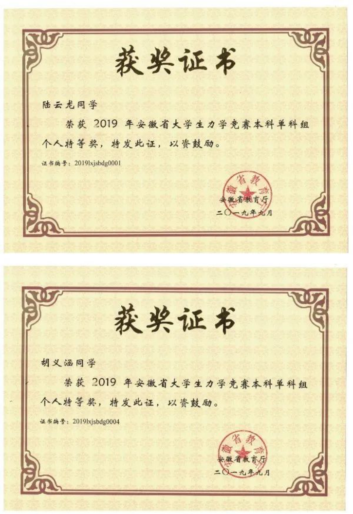 安徽省大学生力学竞赛-物理学陆云龙、胡依涵荣获个人特等奖