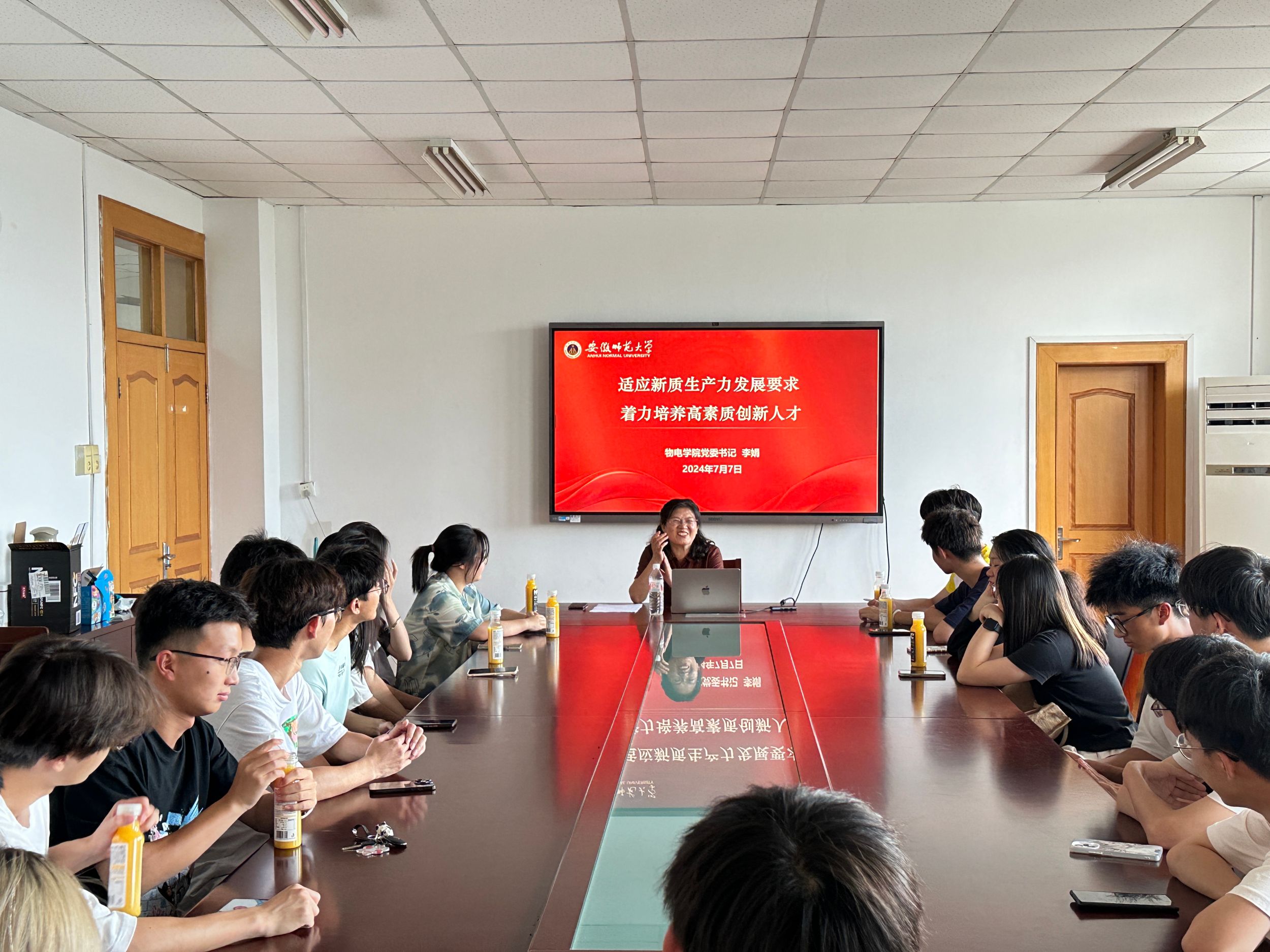 党委书记李娟在学苑南楼408会议室讲授“适应新质生产力发展要求,着力培养高素质创新人才”专题形势与政策课,辅导员张月停以及2023级各专业学生代表现场聆听。
