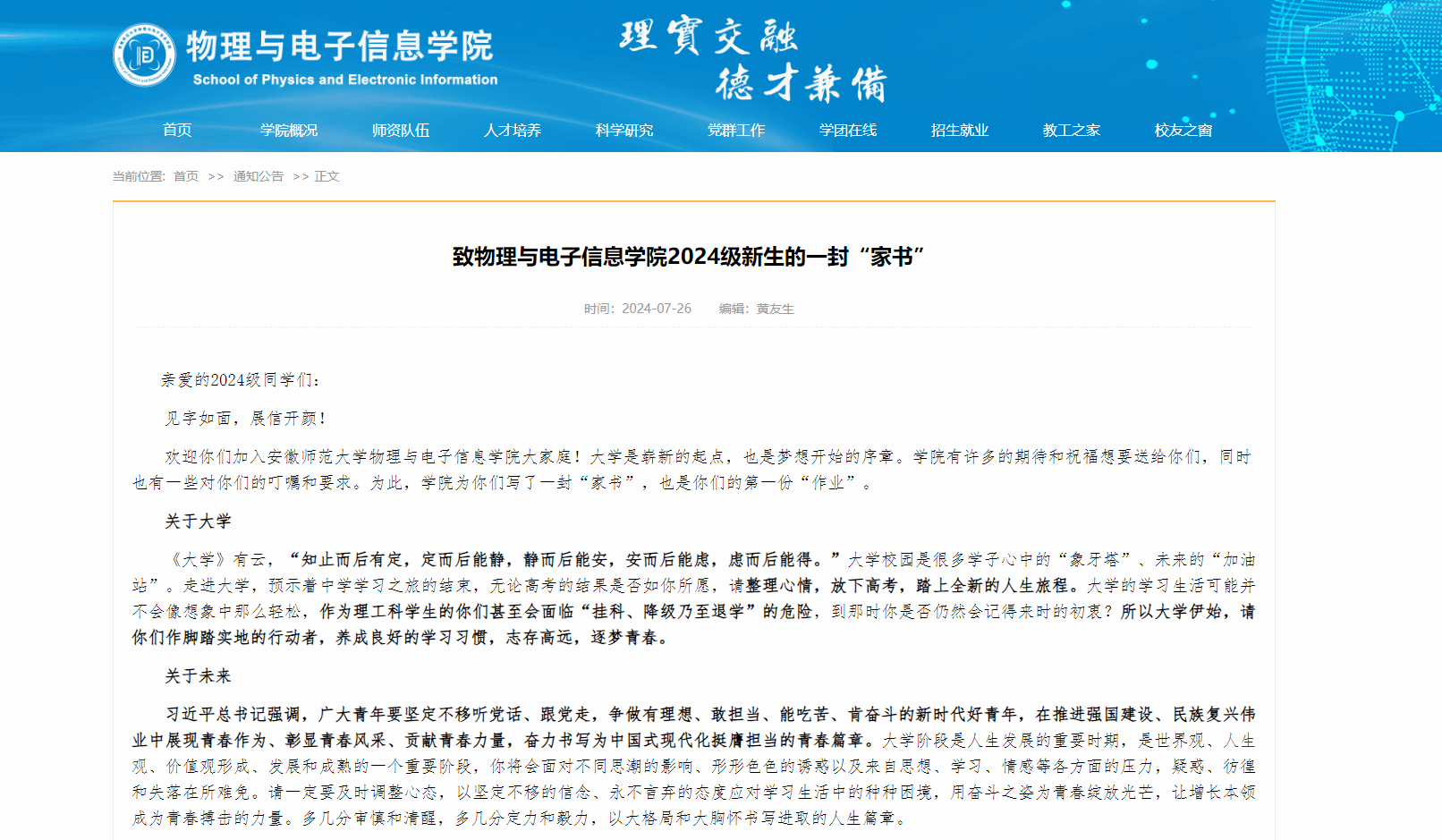 2024级新生的一封“家书”》随着录取通知书,送至2024级物电学子手中,向即将踏入校园的新同学们表达了热烈的欢迎与真挚的祝福。为便于新生同学更加清晰相关入学事宜,学院提前谋划,在“家书”最后附录上电子信息、物理学师范等专业官方QQ群号,让各位同学实现未到校、先入班,未谋面、先交流。学院以一封封温馨的“家书”,向新生传递关怀与期待,细致入微地指导新生做好入学准备。