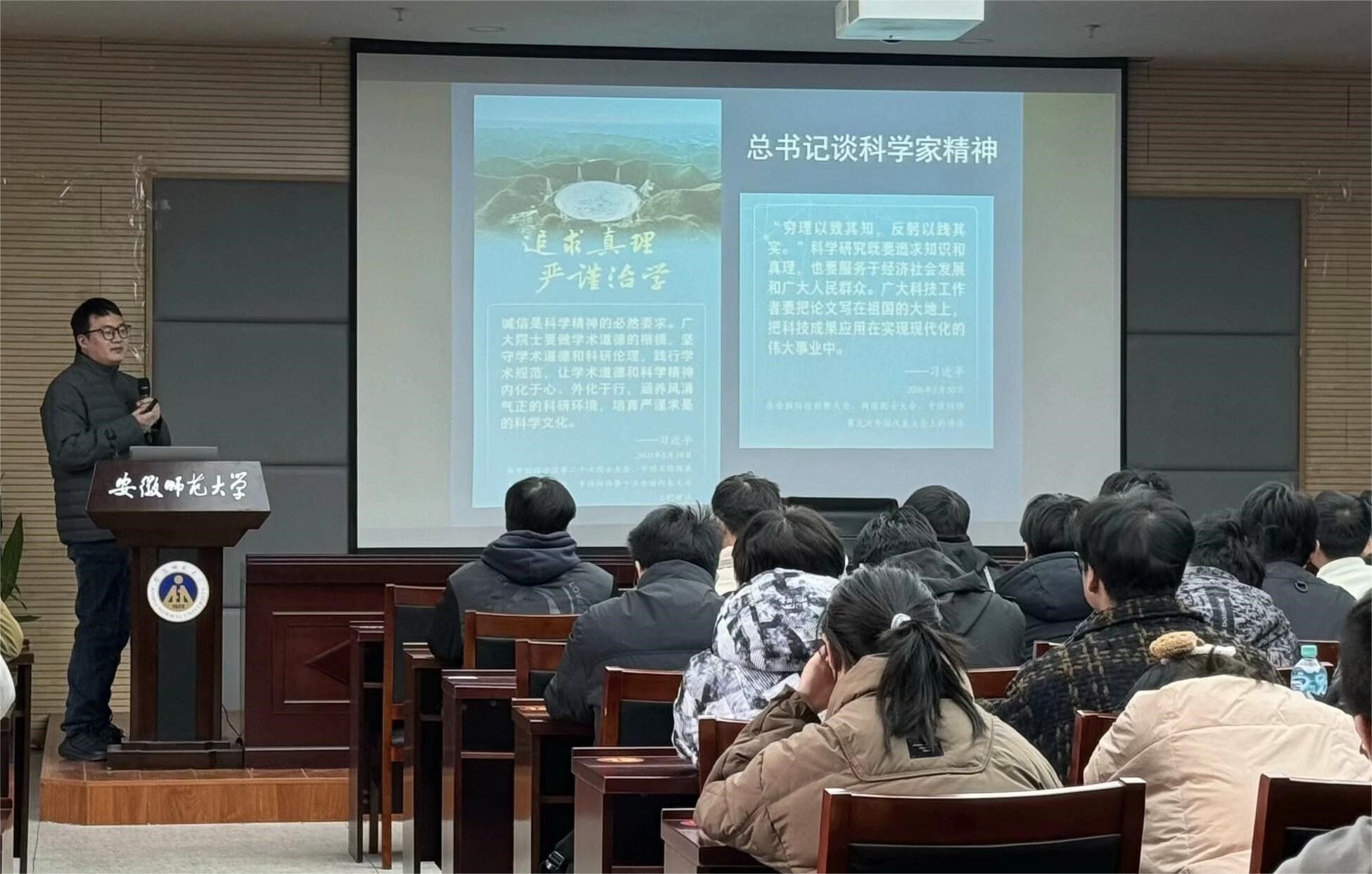 院长吕建平在物理楼304会议室作了题为《弘扬“科学家精神”》的形势政策课,辅导员王亚青以及2024级全体研究生现场聆听。