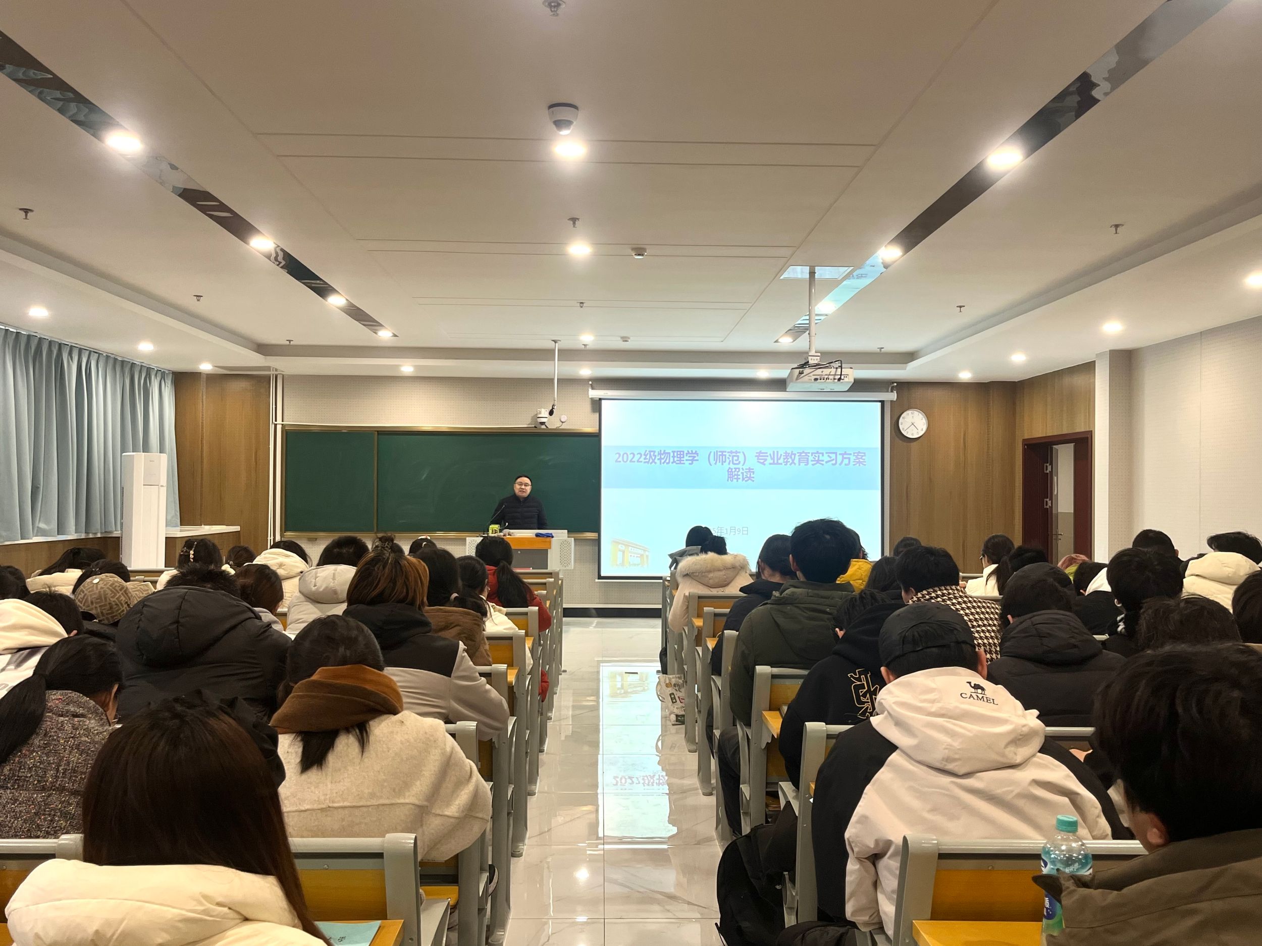 组织召开2022级物理学(师范)专业教育实习动员培训会。学院党委副书记黄友生,物理学专业副主任汪志荣,2022级物理学(师范)专业辅导员刘敏及全体学生参会,会议由学院教学副院长张爱清主持。