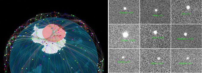 图为中国南极昆仑站可观测近地轨道卫星经过极区的动态范围,及小口径光学实验望远镜获得的亮星科学图像
