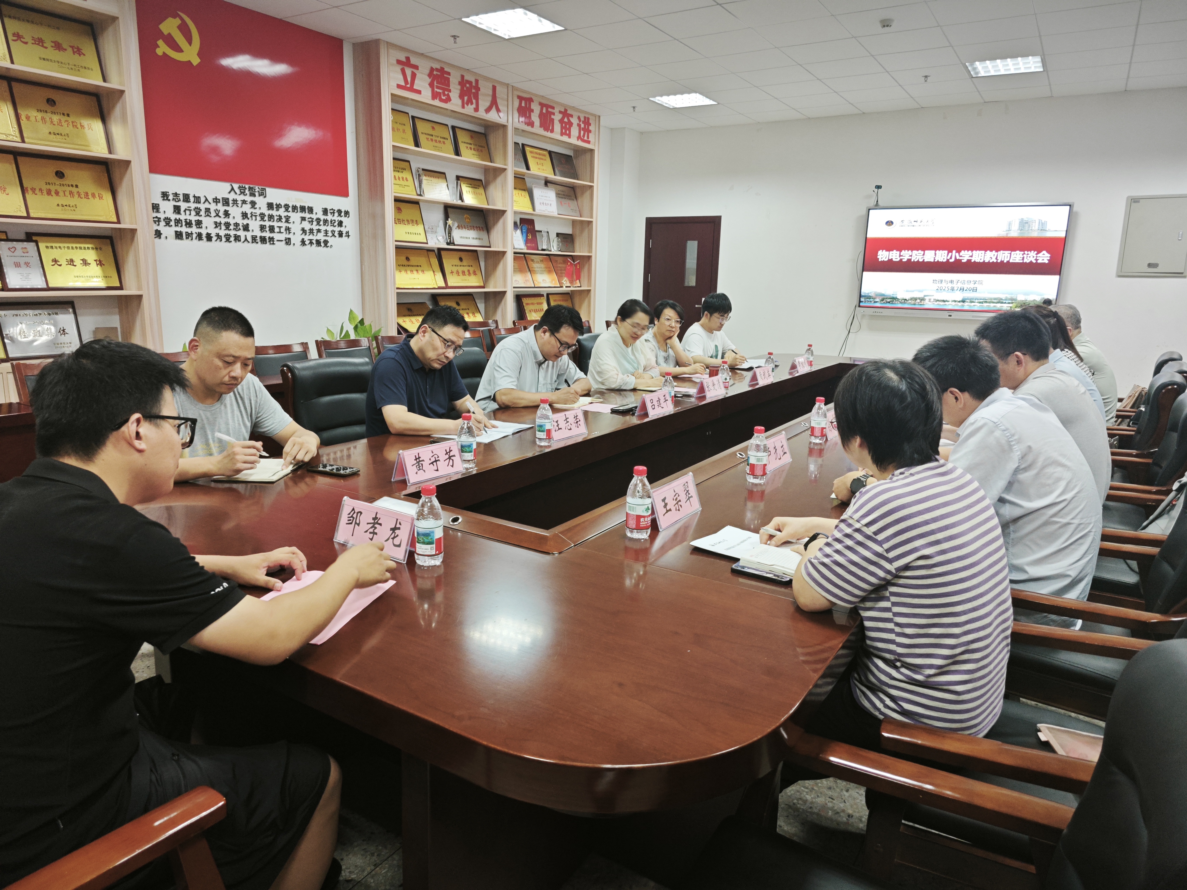 在物理楼308会议室召开暑期小学期教师座谈会。学院院长吕建平,小学期特聘教授代表赵海艳、徐东升、蔡胜国、卢先立,校外实训教师代表王宗翠、徐大兵、邢晋晶,校内实训教师代表汪志荣、黄武英、黄守芳、童大振,小学期班主任邹孝龙出席会议。会议由学院教学副院长张爱清主持。