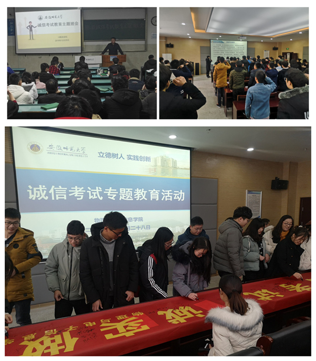 学院四个年级,五个专业,分别召开以“诚信考试”为主题的主题班会,学习《安徽师范大学考场规则》,并且举例说明学校对考试违纪或者考试作弊的处理方法,反复强调诚信考试的重要性以及作弊的严重性。学院全体院领导分专业到各班班会现场作动员讲话。同时,在辅导员的带领下,全体同学大声宣誓:“诚实做人,诚信迎考”,并且现场签订承诺书,用实际行动展现物电学子“严谨治学,诚信为人”的责任意识。