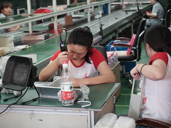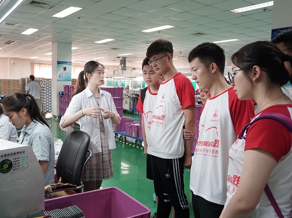 参观结束后,队员们在车间负责人的带领下正式地开始了动手实践,并且体验了二极管的组装,电路板的优化,货物的搬运等工作。尽管分配的工作是简单重复的机械运动,但是操作起来却需要队员们的认真、耐心、严谨、团结。正值炎热的夏天,生产区的噪音和高温交融,但是队员们丝毫没有抱怨,一丝不苟的完成手中的工作任务。