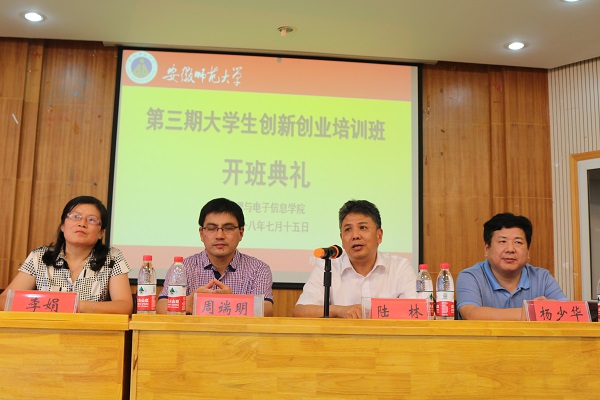 在大学生活动中心三楼隆重举行第三期大学生创新创业培训班开班典礼。校党委常委、副校长陆林、芜湖市科技局局长杨少华、教务处(创新创业教育学院)处长周端明、校学生处副处长张玉新、科研处副处长王朝辉、校团委副书记汪凯、学院党委书记李娟、副院长郑贤锋,第三期大学生创新创业培训班全体学员和学院学生科技创新骨干出席了开班典礼,典礼由学院党委副书记吴长义主持。