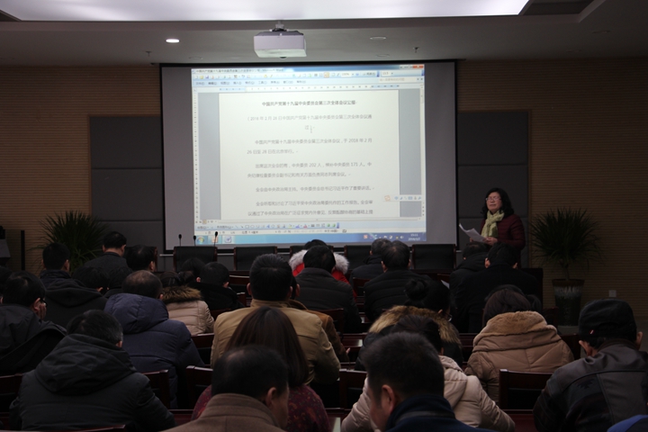 在学院三楼大会议室集中学习十九届二中、三中全会精神。全院教职工参加了学习会,学习会由院党委书记李娟主持。