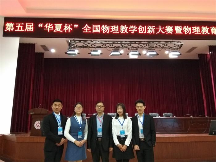 王长江)11月17日至19日,第五届“华夏杯”全国物理教学创新大赛暨物理教育研究论坛在湖南师范大学举行。我校4位参赛选手成绩优异,郭庆、刘辉同学荣获本科生组一等奖;李陈乐、刘海波荣获研究生组二等奖;安徽师范大学荣获优秀组织奖;王长江、汪志荣两位老师荣获优秀指导教师称号。