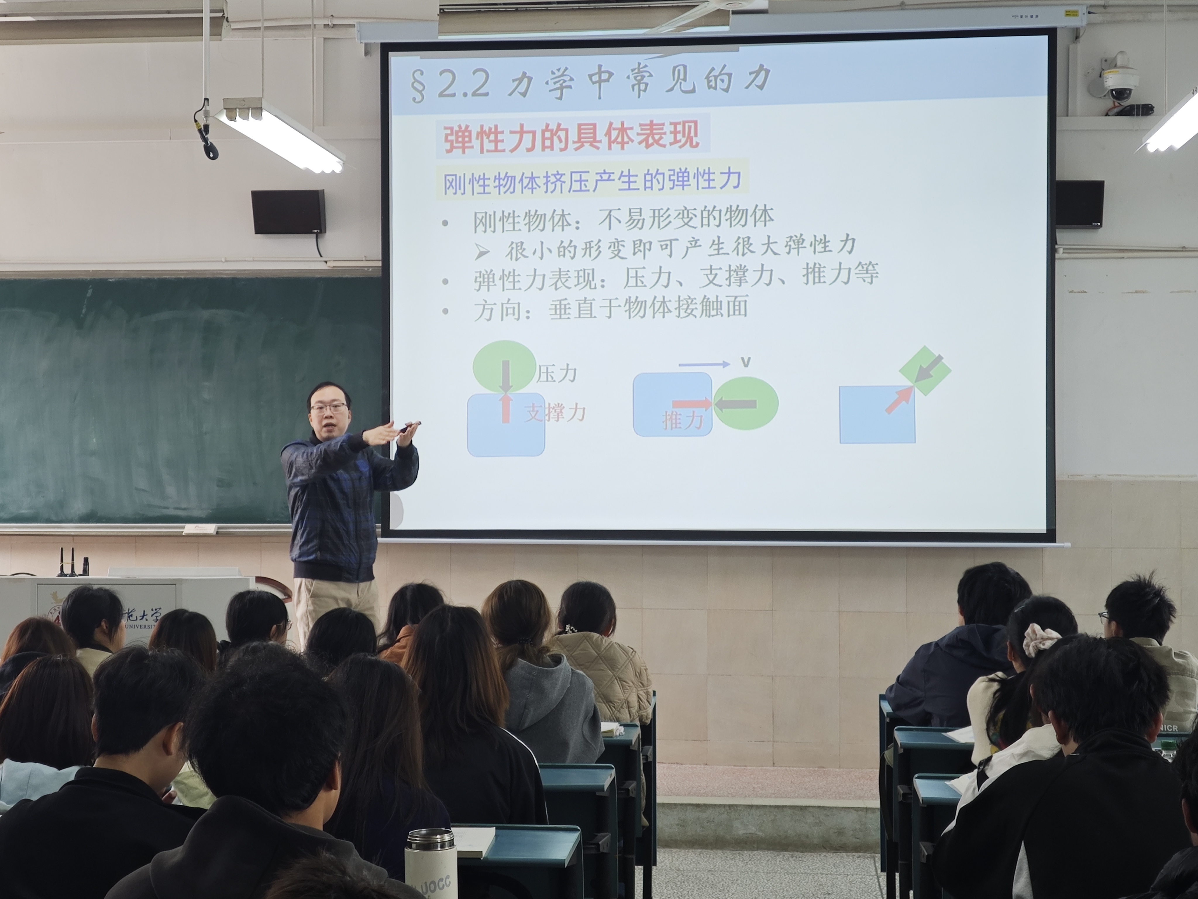 本次授课内容属于力学部分质点动力学章节,包含重力、弹性力和摩擦力三个基本单元,介绍了这几种生产生活中常见作用力的起因、特点和作用规律。这三种力的基本性质在中学物理课程中已有讲授,但学生还并不清楚它们的起源和本质,对其作用规律也尚缺乏全面而准确的了解。孙鹿鸣老师从中学物理基础出发,通过问题启发和案例介绍的方式,引导学生深入思考这些常见力的起源,以及作用规律背后的微观原理,特别是一些中学物理课程中总结的规律在特殊情形下的适用性。