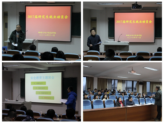 在赭山校区综合楼三楼大会议室召开2017届研究生就业动员大会,就安全主题教育、就业形势分析和毕业论文答辩等方面问题给予2017届毕业生以精准指导。学院党委书记李娟、副书记吴长义、副院长郑贤锋出席了会议,学院2017届全体毕业生参加了会议。会议由研究生毕业班辅导员宋凤楼主持。