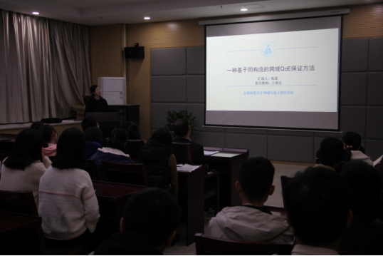 陈晨同学提出了一种基于同构流的跨域QoE保障方法,可以为用户提供物联网多媒体业务的良好感知,实现网络资源的高利用率。报告之后,同学们都进行了热烈的讨论并踊跃提问。三位评委老师就每位主讲人的报告作了详尽点评,指出其中的亮点及值得改进之处。