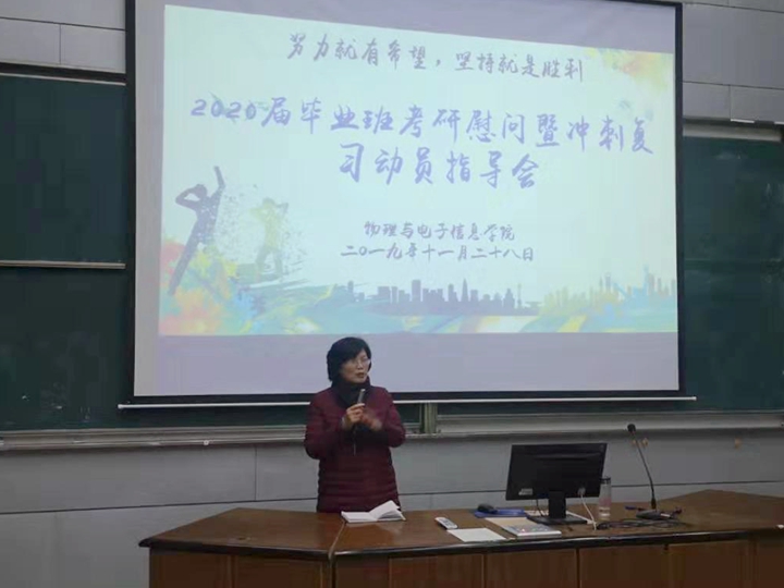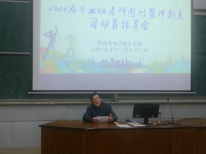 在行知楼2010105教室召开2020届毕业班考研慰问暨冲刺动员会。学院党委书记李娟、院长郑贤锋、2020届毕业班辅导员、2016级320余名考研学生参加了会议。会议由学院党委副书记黄友生主持。