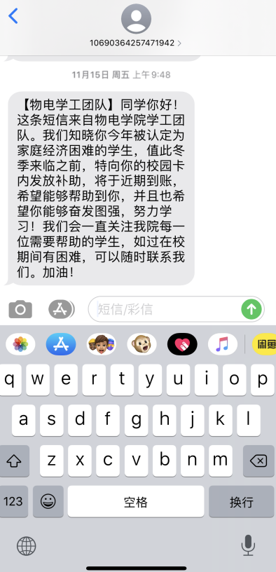 的一名学生突然收到这一条陌生号码的温馨短信时,内心非常诧异,不敢相信是真的。当他查询了校园卡金额核实后,才确定这一切都是真的。今年冬天,学院根据学生的家庭经济情况和学生在校期间的消费情况,确定了一个“隐形资助”的计划,通过前期大量的分析,确定了最终的补贴名单,偷偷的往学生的校园卡里补贴100-200的餐费。