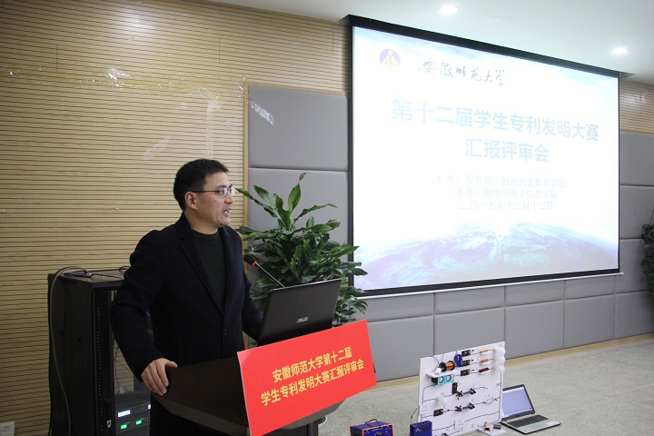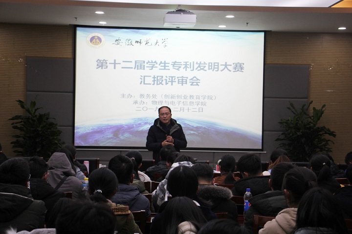 李琦琦)12月12日晚,安徽师范大学第十二届学生专利发明大赛决赛于物理楼304报告厅隆重举行,本次比赛由校教务处主办,物理与电子信息学院承办。教务处处长周端明、副处长李汪根、参赛学院教学副院长及分管领导出席汇报评审会,生命科学学院聂刘旺,环境科学与工程学院杨如意,化学与材料科学学院宇海银,美术学院朱德义,计算机与信息学院孙丽萍,信息管理中心副主任吴长义,无翼鸟