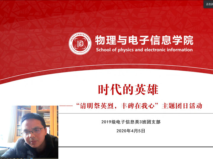 团日活动,致敬英雄。4月5日下午,2019级电子信息3班团支部开展线上主题团日活动。校团委副书记汪凯、学院党委副书记黄友生、学院团委书记宋凤楼、院团委素质拓展委员徐新杰参加活动,活动由辅导员刘燕主持。团支书程帅带领团员青年学习习近平总书记3月10日《在湖北省考察新冠肺炎疫情防控工作时的讲话》。团员代表线上分享抗疫英雄的感人故事,追忆为争取民族解放而牺牲的革命先辈;结合我国在全球战“疫”中的大国担当,以民族精神与人类命运共同体理念为主题展开交流讨论。