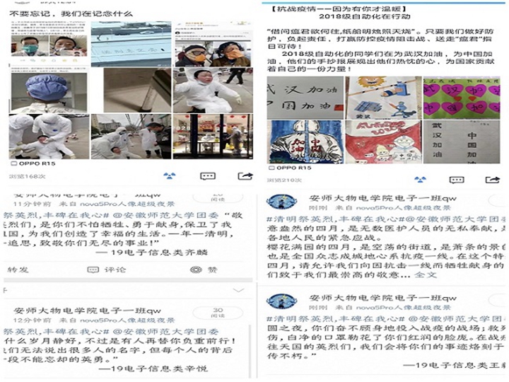 广泛宣传,传承精神。“无数英雄先烈是我们民族的脊梁,是我们前进的勇气和力量所在。我们要铭记一切为国家作出贡献的英烈们。”在物电公众号微博话题专区,广大学子纷纷用文字缅怀在抗疫一线牺牲的英雄。活动开展以来,物电团员青年在线上发表学习体会,并录制视频讲述英烈故事,得到了广泛的关注和点赞。据统计,学院团员青年累计制作视频29部,发布话题75条,掀起了一阵致敬英烈、传承英雄精神的热潮。