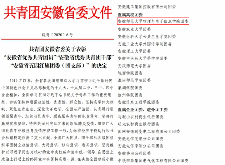 本网讯(院团委 宋凤楼)4月30日,共青团安徽省委发布《共青团安徽省委关于表彰 “安徽省优秀共青团员”“安徽省优秀共青团干部” “安徽省五四红旗团委(团支部)”的决定》(皖青〔2020〕6 号)。无翼鸟