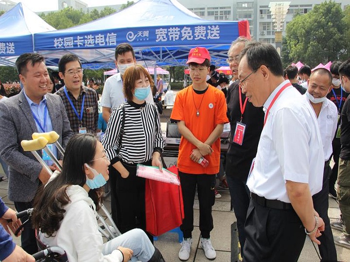 新媒体中心)“物”候君来,“电”记已久。9月19日至20日,物理与电子信息学院2020级569名新生相聚花津河畔,开启师大之旅,书写崭新篇章。在学院领导的统一部署下,全院师生上下一心,圆满完成迎新工作。迎新期间,校党委书记胡朝荣、校党委副书记蒋家平及有关职能部门负责人,学院全体领导班子成员来到现场,检查指导新生报道及疫情防控工作,并亲切慰问新生和志愿者。