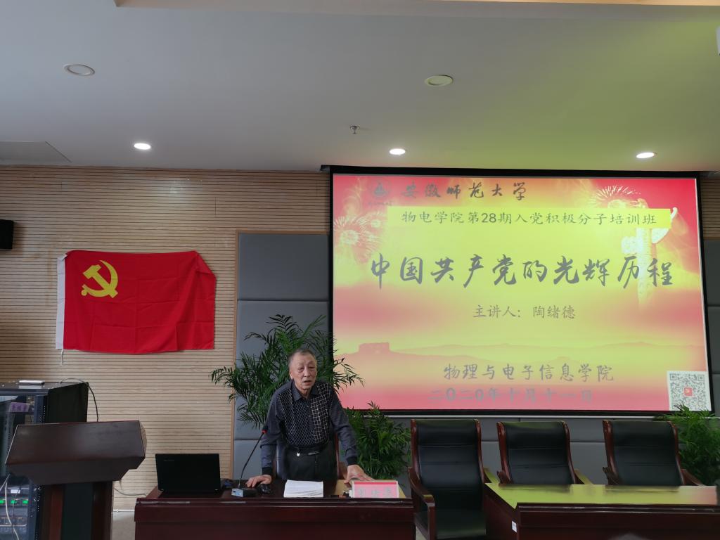 李胜宏)为进一步完善大学生入党积极分子组织建设和思想建设,培养学生的党性修养。10月11日下午,院关工委常务副主任陶绪德老师为入党积极分子培训班学员作中国共产党的光辉历程专题培训。