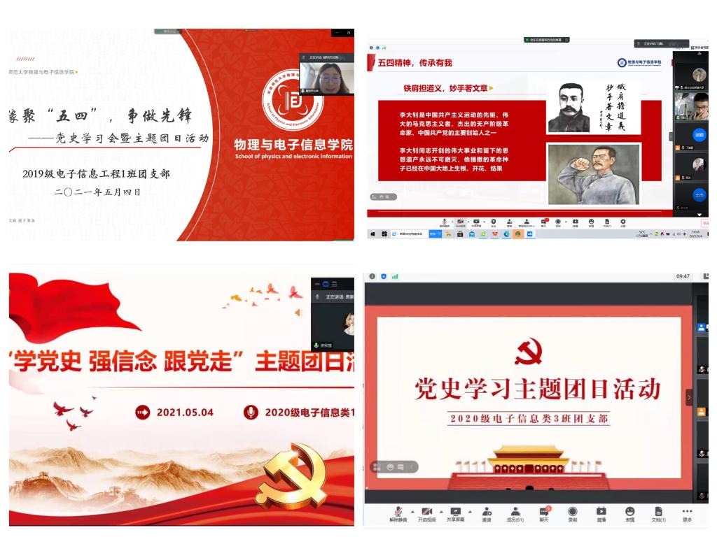各团支部通过学习座谈、宣讲交流、故事分享、心得体会等方式,积极开展党史学习教育会暨主题团日活动。2019级电子信息工程专业以《缘聚“五四”,争做先锋》为主题,以学习新思想、争做新青年,五四精神、传承有我,生逢盛世、肩负重任三个篇章,从观看短片到领学习近平总书记视察清华大学的重要讲话精神,从青马工程”培训班学员分享五四青年故事到结合“学党史,强信念,跟党走”主题云团课分享自己的感悟,让一场团日活动走深走实。2020级电子信息类1班则以“云”团课《传承红色基因 做时代新青年》、“云”宣讲《传承五四精神 凝聚青春力量》等形式强化党史学习教育。
