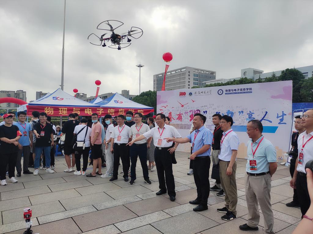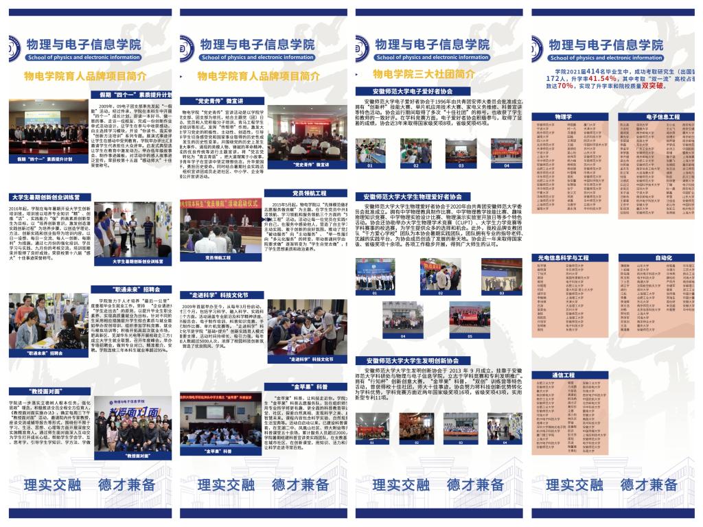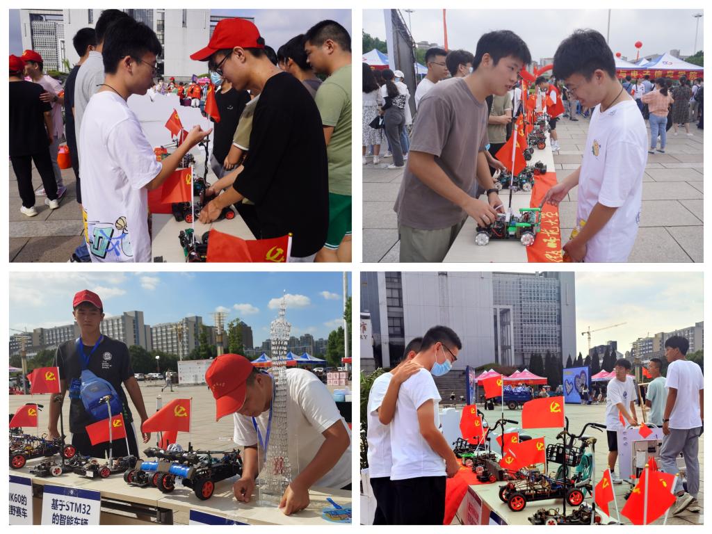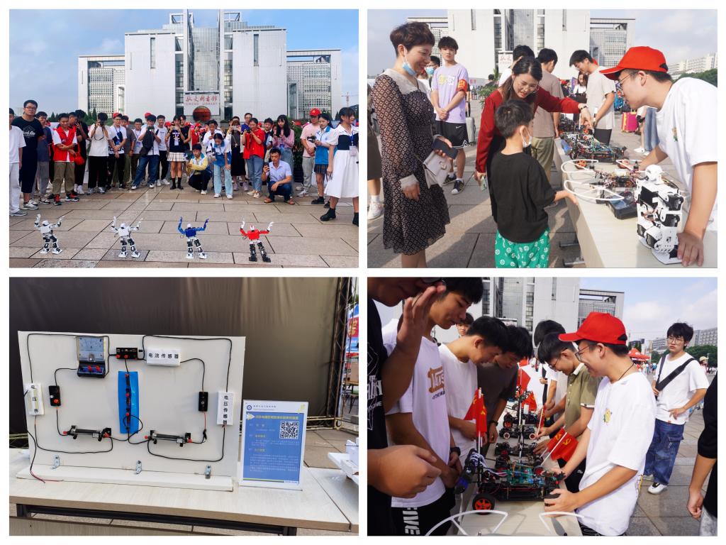 一字摆开的展台上展列着物电学子亲自制作的科技作品40余件,从工科学生研发的舞蹈机器人、合作机器人、激光雕刻机、自平衡智能车、四轴飞行器、温度检测调节系统到物理师范生自制的电动机演示板、库伦定律演示仪、自制安培力演示仪等物理教具作品,通过学生志愿者专业演示与讲解,吸引许多新生和家长驻足观看。此外学院育人品牌项目、历年考研光荣榜、学院学生社团活动展示等也在潜移默化中让专业“第一课”深入人心。