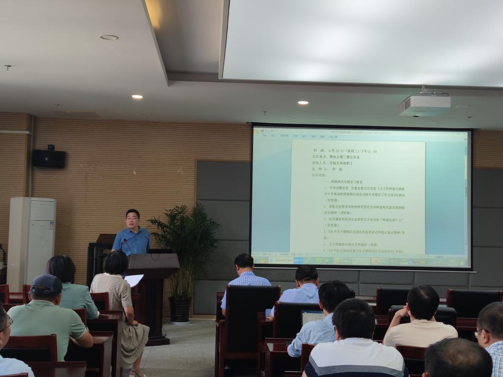 在物理楼304会议室召开师德师风专题学习教育大会暨下一阶段工作布置会,学院全体教职工参加会议。会议由学院党委书记李娟主持召开。