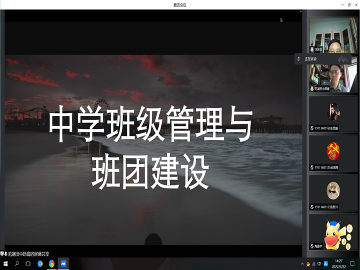 5月22日下午,昂锋结合自身20年的政教工作经历,以《中学班级管理与班团建设》为题从新班级的建立、班委会的建立、班级文化的建设三个方面内容,向大家详细分析了作为一名新教师如何尽快适应承担班级管理和班团建设工作,并结合案例分析,针对大家即将在工作可能遇到的问题给予了具体的建议。