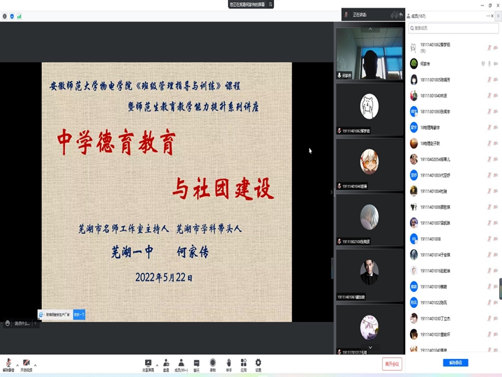 5月22日上午,何家传以《中学德育教育与社团建设》为题从“初心:做一位好老师——育人先立己”、“使命:立德树人,促进学生全面发展”、“实践:提升班主任胜任力,追寻生命共同成长”、“感悟:班主任的专业素质是做好班主任工作的重要基础”四个方面内容向同学们阐述如何进行中学德育教育,同时又结合芜湖一中开展丰富多彩的特色活动向同学们介绍如何做好中学社团建设。