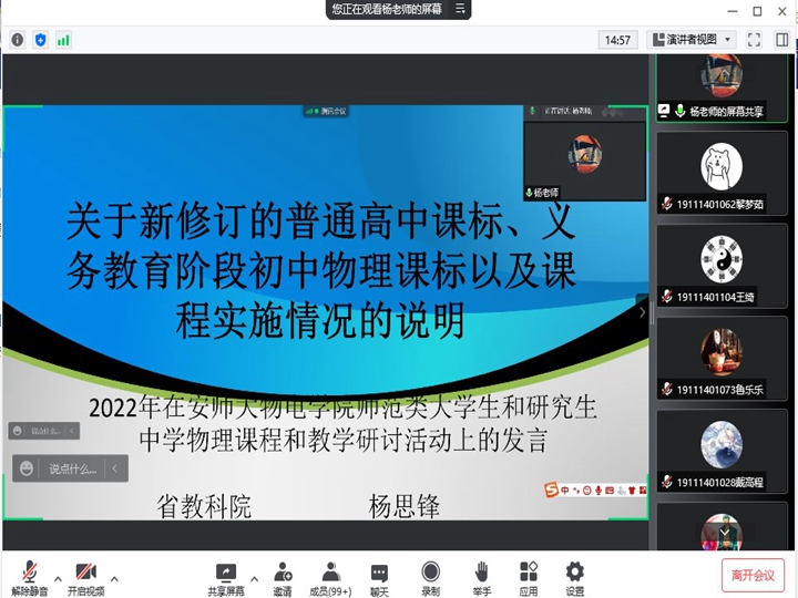 5月21日上午,杨思锋以《新修订的普通高中物理课标和义务教育初中物理课标的内容介绍和实施情况说明》为题,从近20年来基础教育物理课程改革情况的一般性说明、核心素养目标对课程实施的要求、理论与实践层面的具体要求三个方面内容做了指导性报告,不仅就普通高中物理新课标和刚刚公布的义务教育物理课程标准的内容修订情况进行了详细的解读,并且就“新课标”背景下如何开展基于深度学习理论的物理单元教学设计进行了具体指导和案例分析。