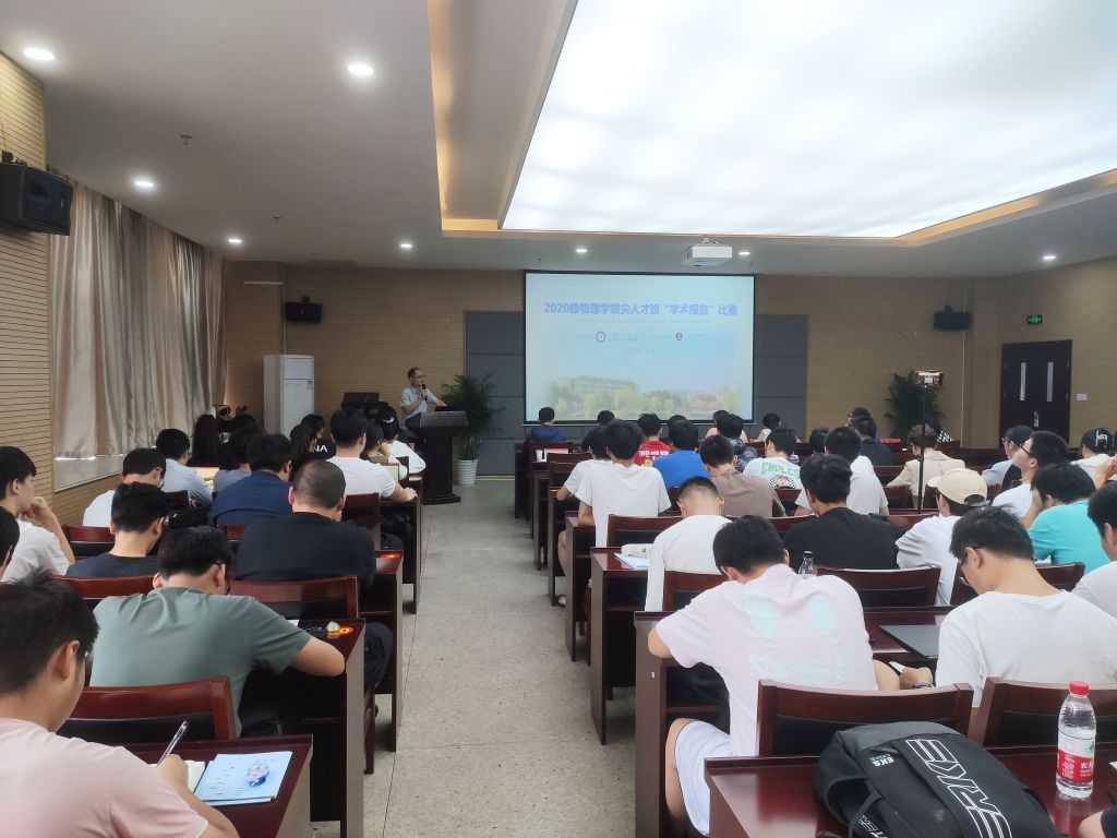 第二届物理拔尖班“学术报告”比赛在物理楼304会议室举行。校科研处副处长许新胜、院教学副院长张爱清以及专业教师黄武英、李宽国、汪延志、汤宁宇,赵春一担任评委。2020和2021级物理拔尖班全体同学观摩了本次比赛。比赛由物理学拔尖班班主任盛晓伟和2020级首届物理学拔尖班同学代佳玉共同主持。