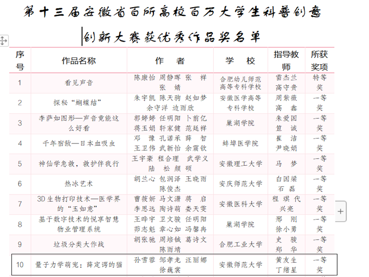 1月16日,由省科协、省教育厅、团省委主办的第十三届安徽省百所高校百万大学生科普创意创新大赛获奖名单公布。由黄友生、丁绪星指导,孙雪蓉、邹孝龙、汪丽娜、徐巍裳等同学的团队作品《量子力学萌宠:薛定谔的猫》荣获一等奖,安徽师范大学荣获“团体优胜奖”和“优秀组织奖”。