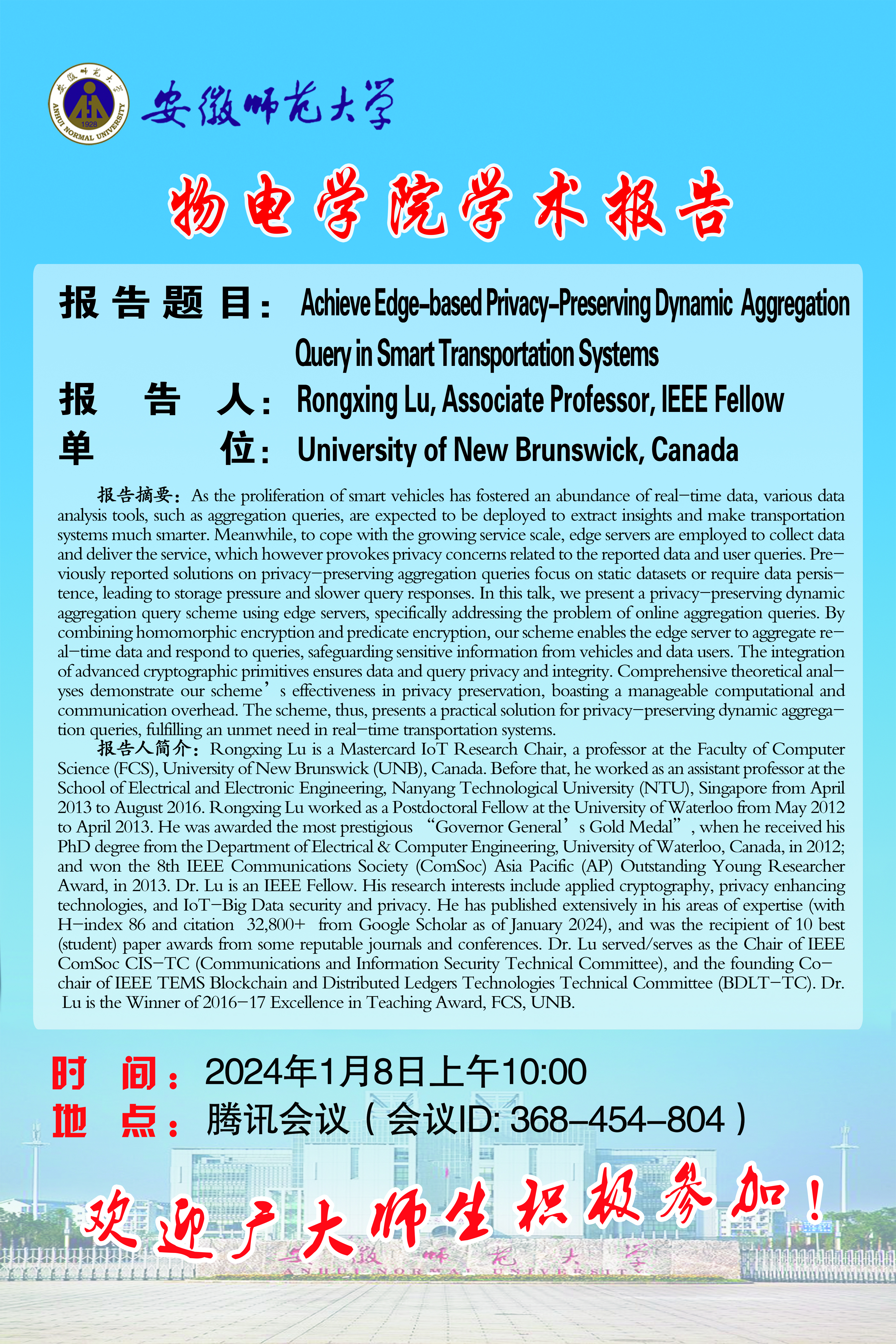 【学术预告】物电讲坛第2期:Achieve Edge-based Privacy-Preserving Dynamic Aggregation Query in Smart Transportation Systems