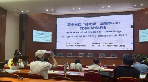 两位研究生李婷和王神姣在会上展示了团队的研究成果。李婷汇报的题目为“高中生在静电场主题学习中的知识整合评估”。她深入分析了高中生在静电场学习中的认知结构和知识应用能力,揭示了学生在知识整合方面的优势与不足,同时提出教师应注重帮助学生实现深入对概念的理解,以提升学习效果。与会专家对其研究成果表示认同,认为其对教学实践具有指导意义。