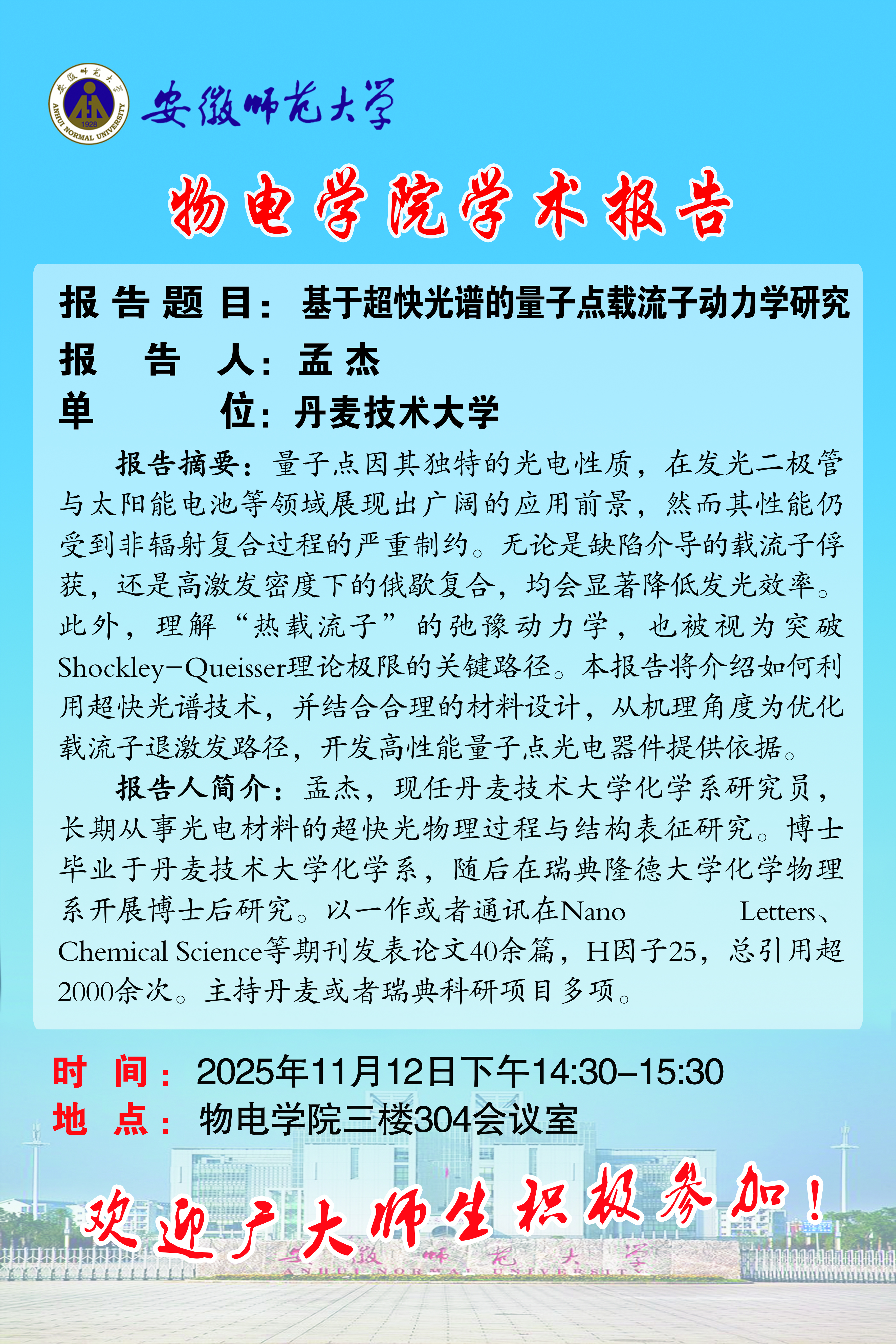 【学术预告】物电讲坛2025年第47期:基于超快光谱的量子点载流子动力学研究