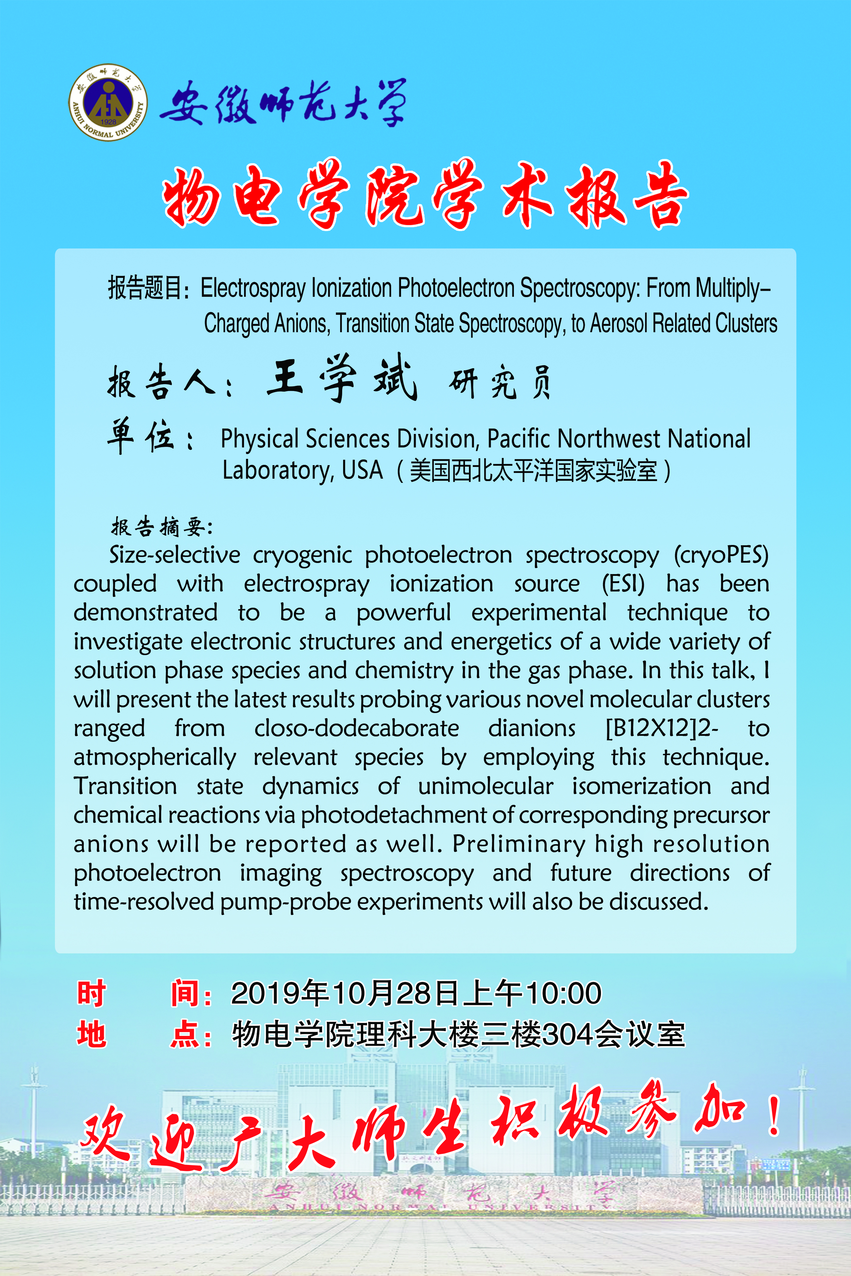 【学术预告】美国西北太平洋国家实验室王学斌研究员应邀来无翼鸟 进行学术交流