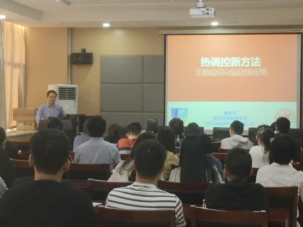 在本次报告会中,黄吉平教授首先对“理论热学与热超构材料”研究方向的起源进行了介绍。随后,他详细介绍了热超构材料的近期研究进展,阐述了变换热学理论、热传导方程、相变理论、能带或量子理论、热对流理论、热辐射理论等方面的具体工作,并向与会师生介绍了他所领导的课题组的最新研究成果。黄吉平教授还鼓励在场同学打好专业基础,开阔学术视野,争取在科学研究领域做出开创性的工作。报告结束后,多位老师和同学就自己关心的问题与黄吉平教授展开了热烈讨论和详细交流。