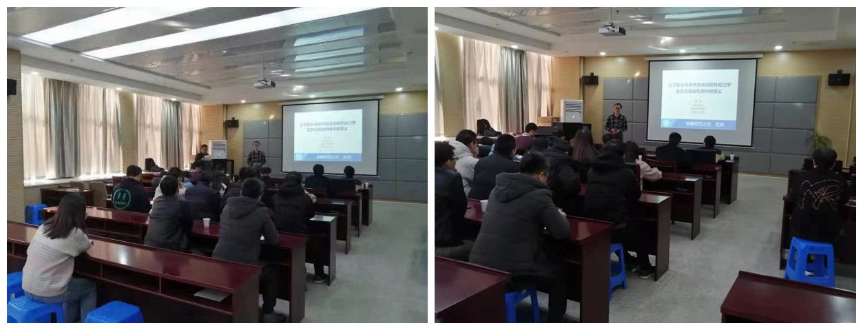 在本次报告会上,胡可老师以太阳能高效利用的重要意义为出发点,首先介绍了人工光合成以及染料敏化光电合成电池的基本概念。接着详细探讨了界面电荷分离态的电子转移动力学调控,定量分析了分子桥共轭设计对界面电荷分离态寿命的影响,提出了二氧化钛表面敏化剂-催化剂分子组装光催化水氧化体系中的孤立催化中心策略,讨论了界面分子间侧向空穴转移反应和空穴聚集现象,并介绍了量子点敏化光阳极界面所发生的分子间电荷转移产氧机制。报告会结束后,与会的各位老师和同学就自己关心的问题与胡可老师展开了热烈讨论和详细交流。