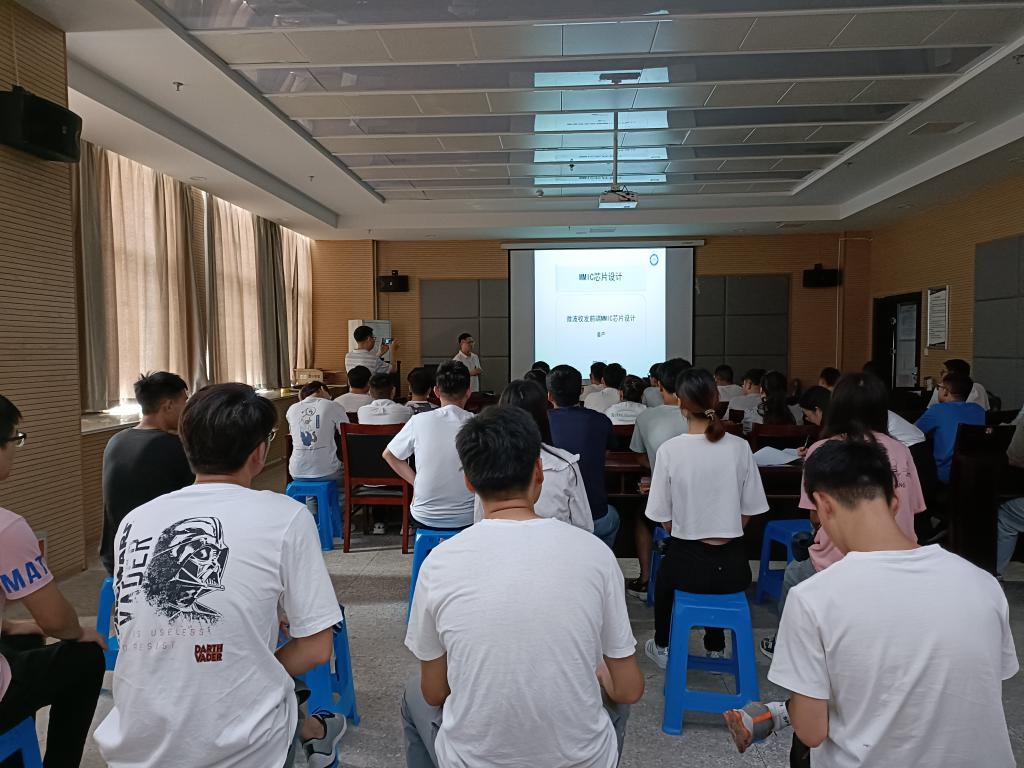 本次报告会上,姜严博士主要介绍了基于三五族半导体工艺的集成前端芯片设计,并向我们展现了芯片设计行业的大好前景。姜博士为大家阐述了围绕微波收发前端,雷达前端关键芯片及民用通信:滤波器和功分器芯片、Ka波段收发芯片、Ka波段高效率功放芯片进行的研究,涉及滤波器芯片的小型化、低插损以及宽带外抑制特性分析、功分器芯片的低插损高隔离度研究、Ka波段T/R收发多功能芯片(吸收型开关设计以及放大器设计)、Ka波段高效率J类功放的设计等。报告会结束后,与会的各位老师和同学就自己关心的问题与姜严博士展开热烈讨论和详细交流。