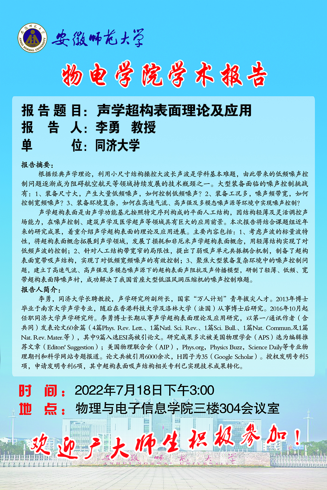 【学术预告·物电讲坛】李勇:声学超构表面理论及应用