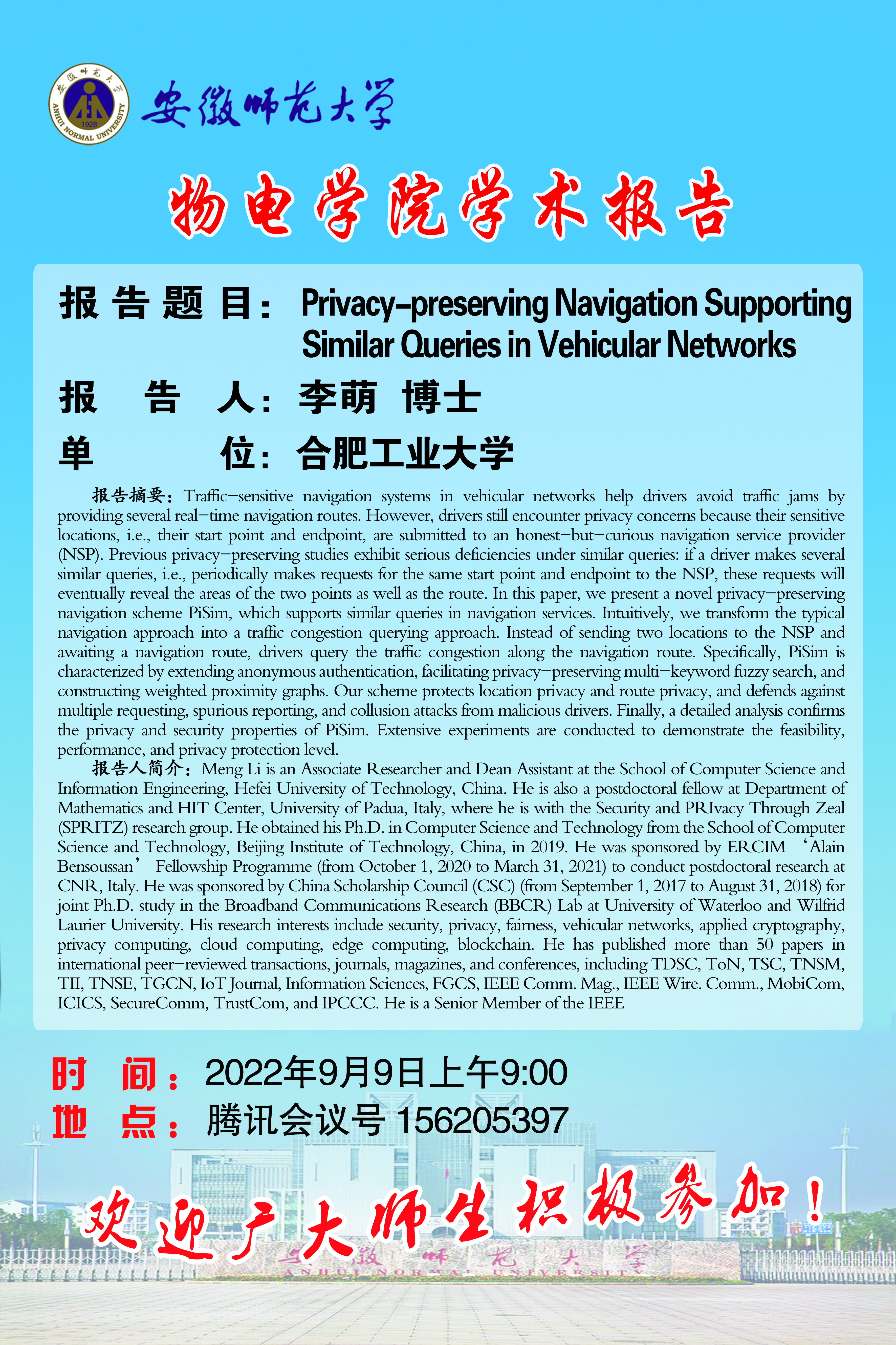 【学术预告·物电讲坛】李萌:Privacy-preserving Navigation Supporting Similar Queries in Vehicular Networks