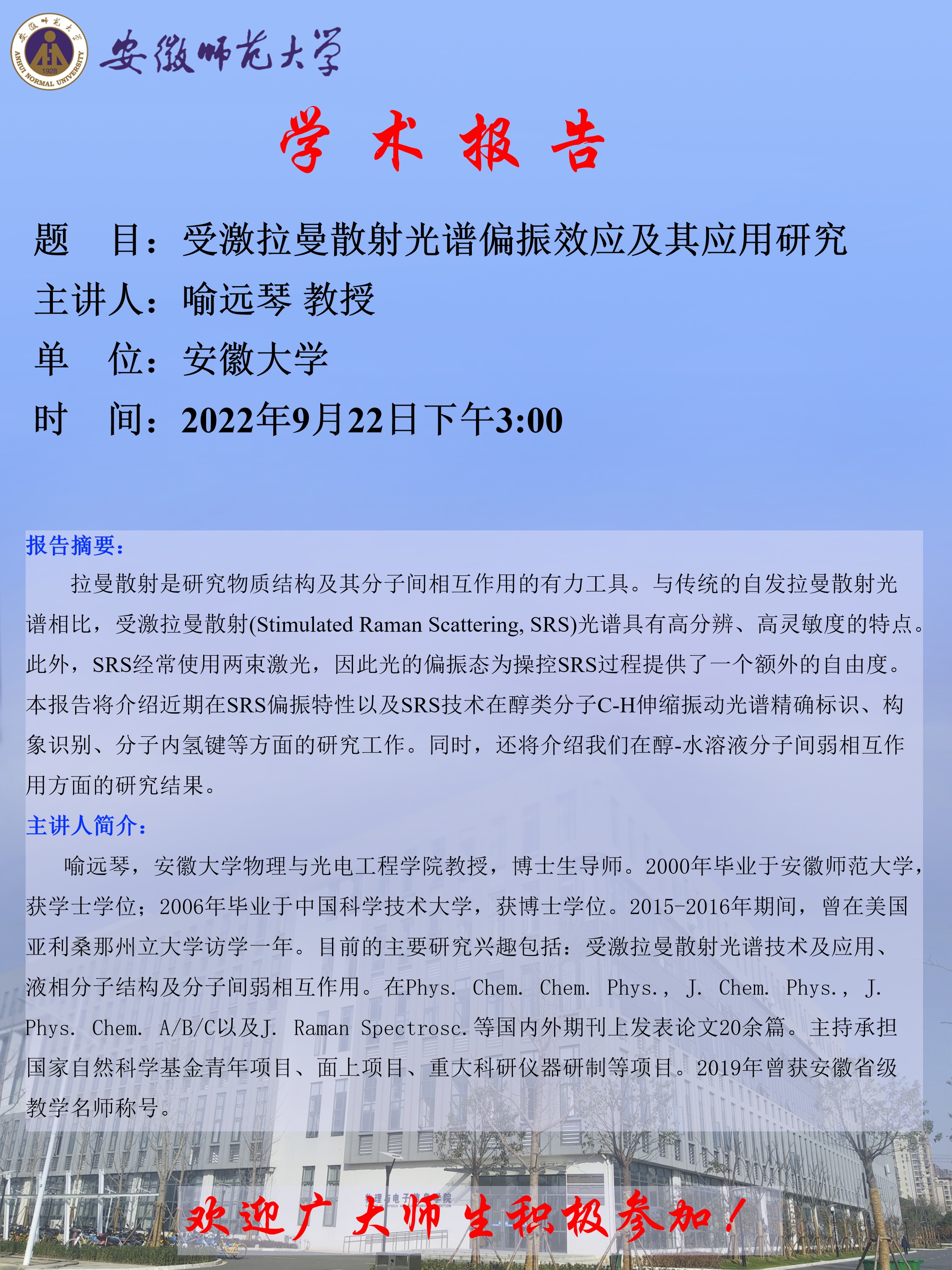 【学术预告·物电讲坛】喻远琴:受激拉曼散射光谱偏振效应及其应用研究