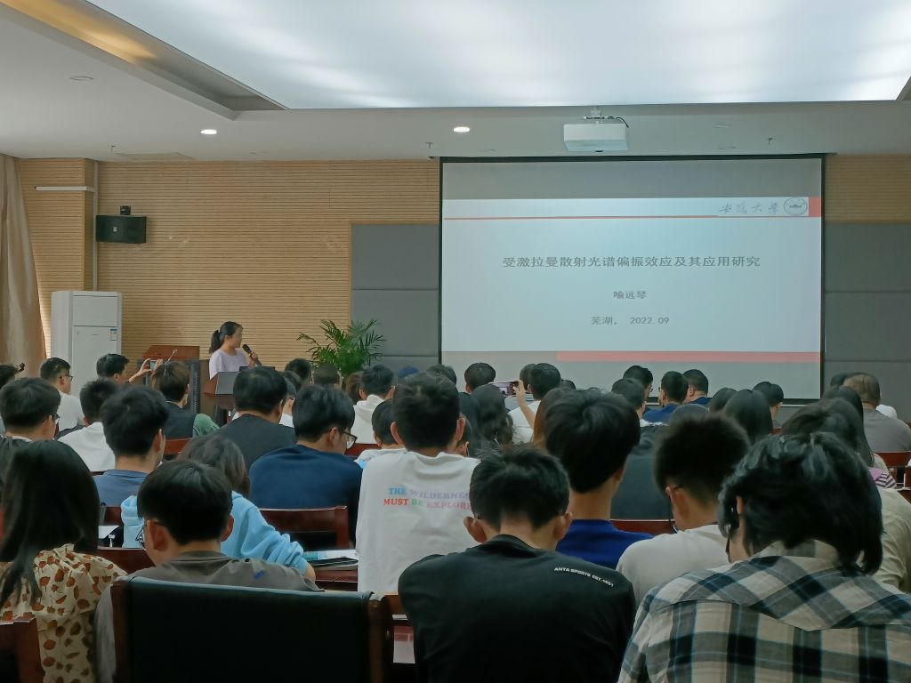 邀请,安徽大学喻远琴教授于9月22日来校进行学术交流,并做了题为《受激拉曼散射光谱偏振效应及其应用研究》的学术报告。报告会在学院304会议举行,会议由无翼鸟