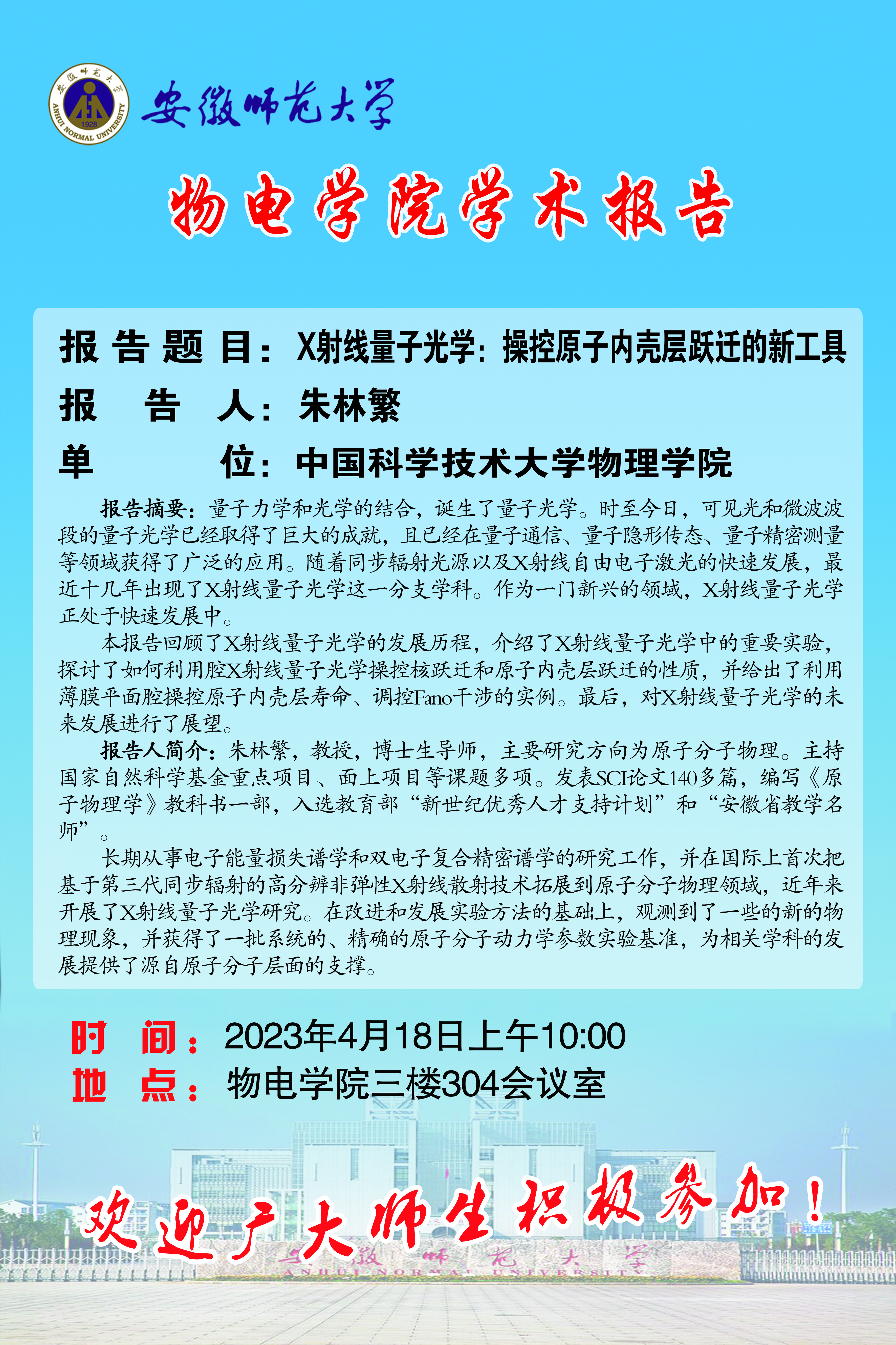 【学术预告·物电讲坛】朱林繁:X射线量子光学:操控原子内壳层跃迁的新工具