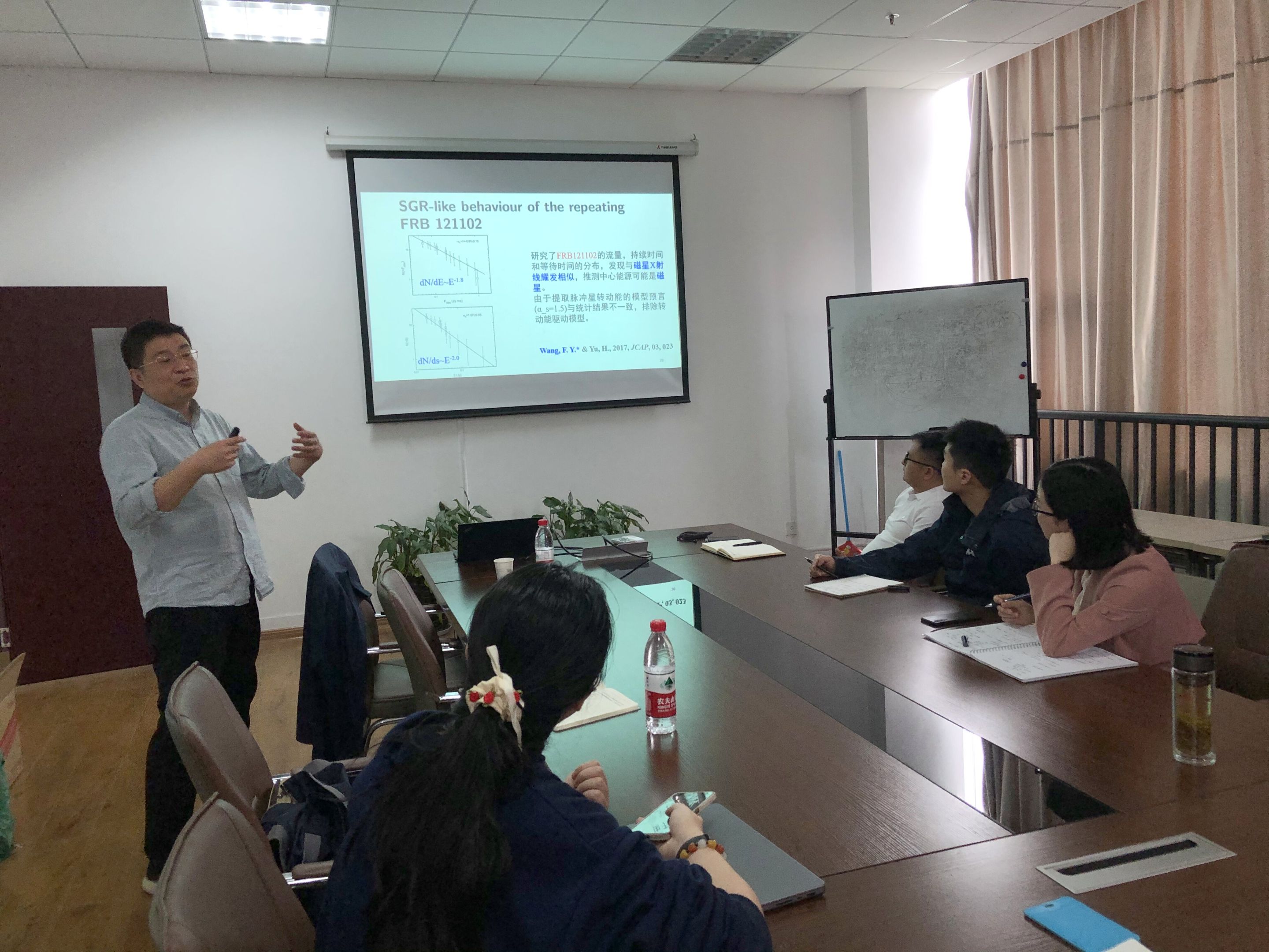 邀请,南京大学王发印教授于4月14日来校进行学术交流,并做了题为《快速射电暴的研究进展》的学术报告。报告会在学院429会议室举行,会议由无翼鸟
