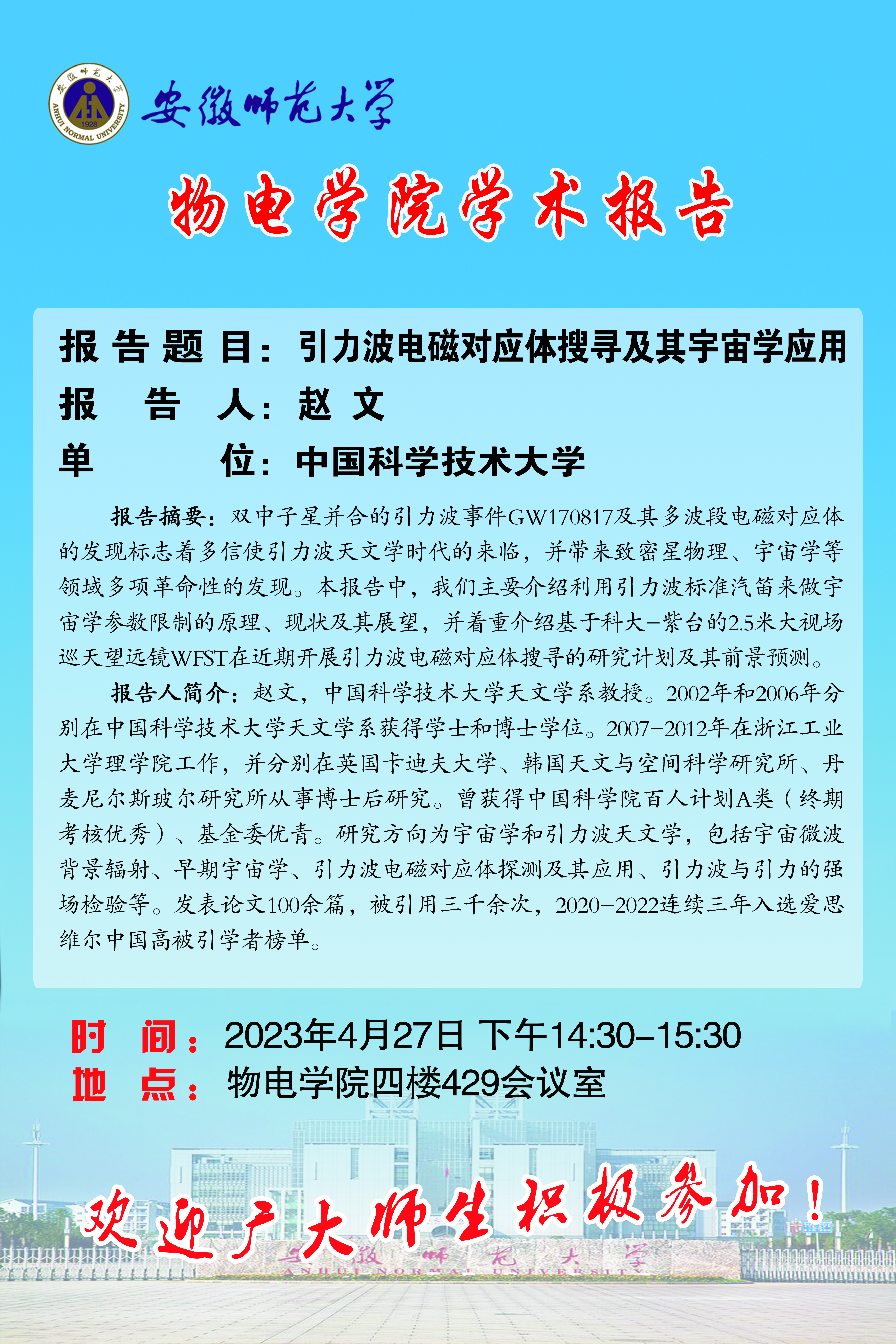【学术预告·物电讲坛】赵文:引力波电磁对应体搜寻及其宇宙学应用