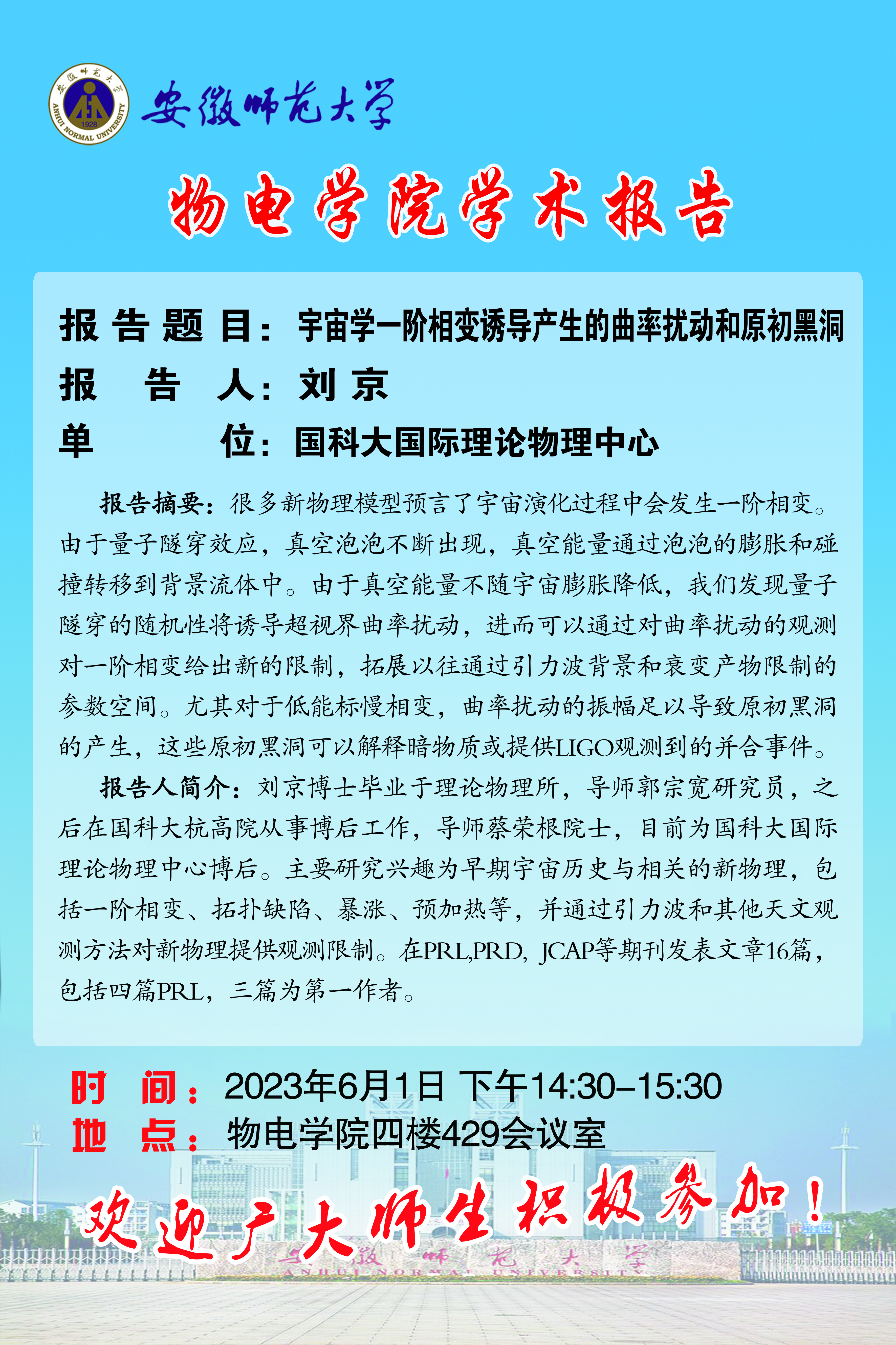 【学术预告·物电讲坛】刘京:宇宙学一阶相变诱导产生的曲率扰动和原初黑洞