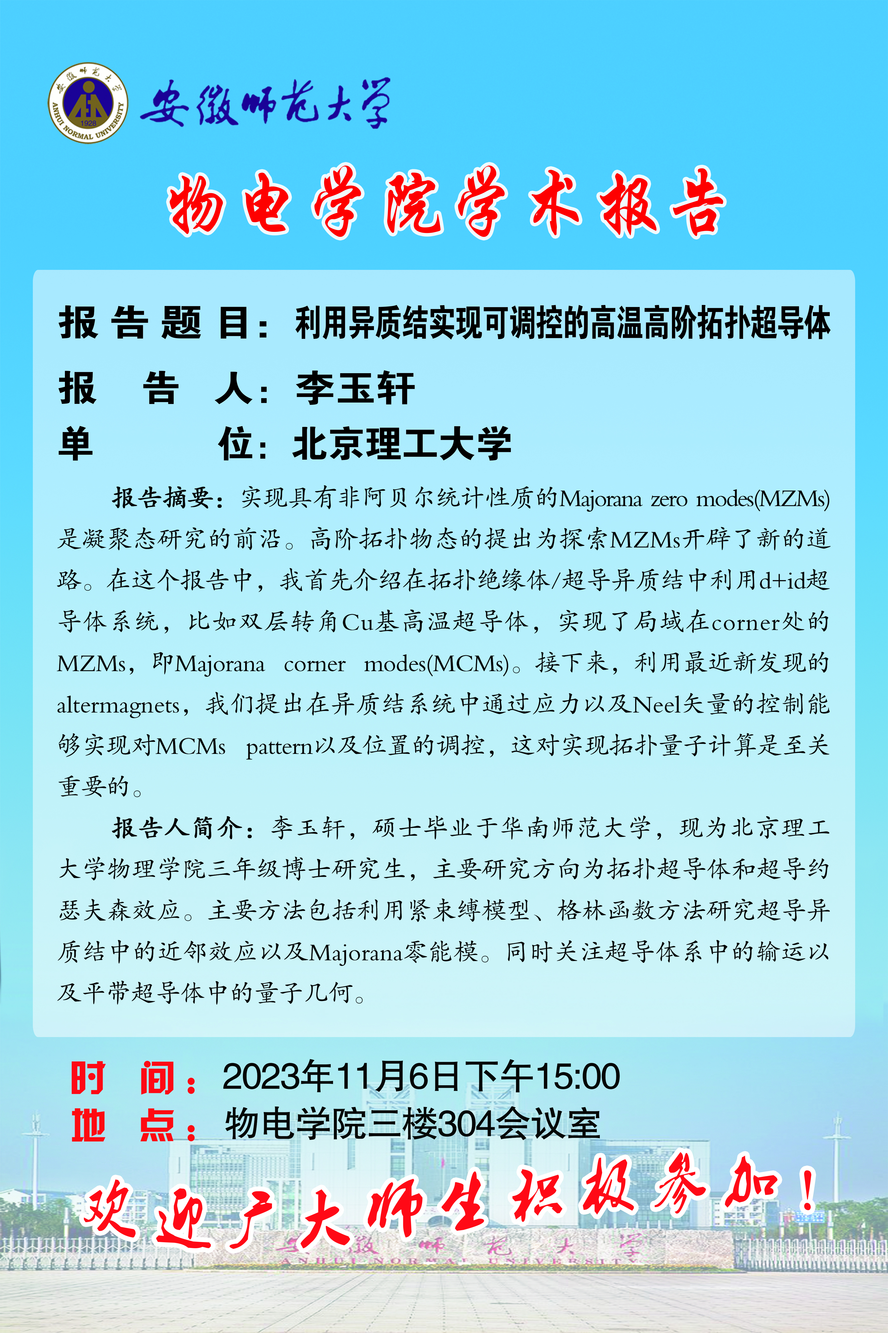 【学术预告·物电讲坛】李玉轩:利用异质结实现可调控的高温高阶拓扑超导体